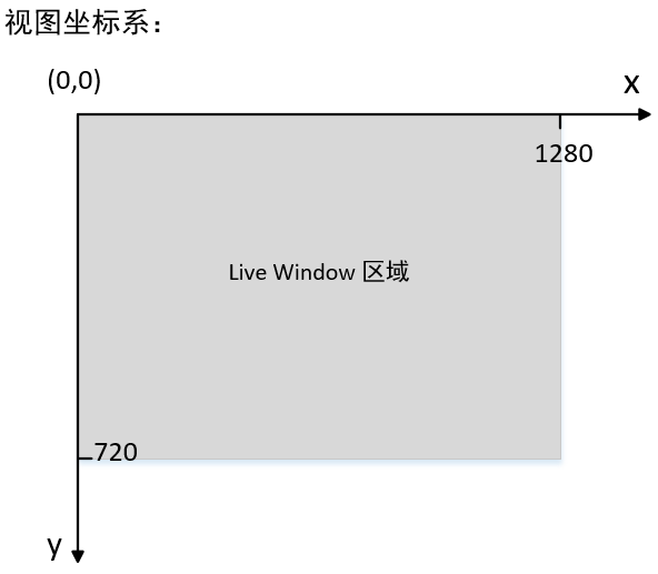 视图坐标系是Live Window控件播放视频使用的坐标系。在播放预览视频时,可设置Live Window的填充模式。如果需要将对应的时间线坐标转换成视图坐标,有相应的API接口可供调用进行转换。具体请参见 NvsLiveWindow的转换接口。 视图坐标原点位于实时预览窗口的左上角,X轴向右,Y轴向下。如下图,视图坐标: