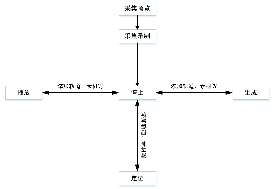 图中每个矩形框都表示一种引擎状态。由图可见,添加轨道、素材等会引发引擎状态发生变化。播放、定位、生成三种状态之间相互转换,都需要经过引擎停止状态。而由采集预览跳转采集录制状态,不用跳转到停止状态。视频录制完成后,要经过停止状态,才能跳转到播放,定位及生成状态。