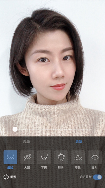 美型具有,瘦脸、小脸(脸拉长收短)、大眼、下巴、额头、瘦鼻、嘴形等部位进行调节