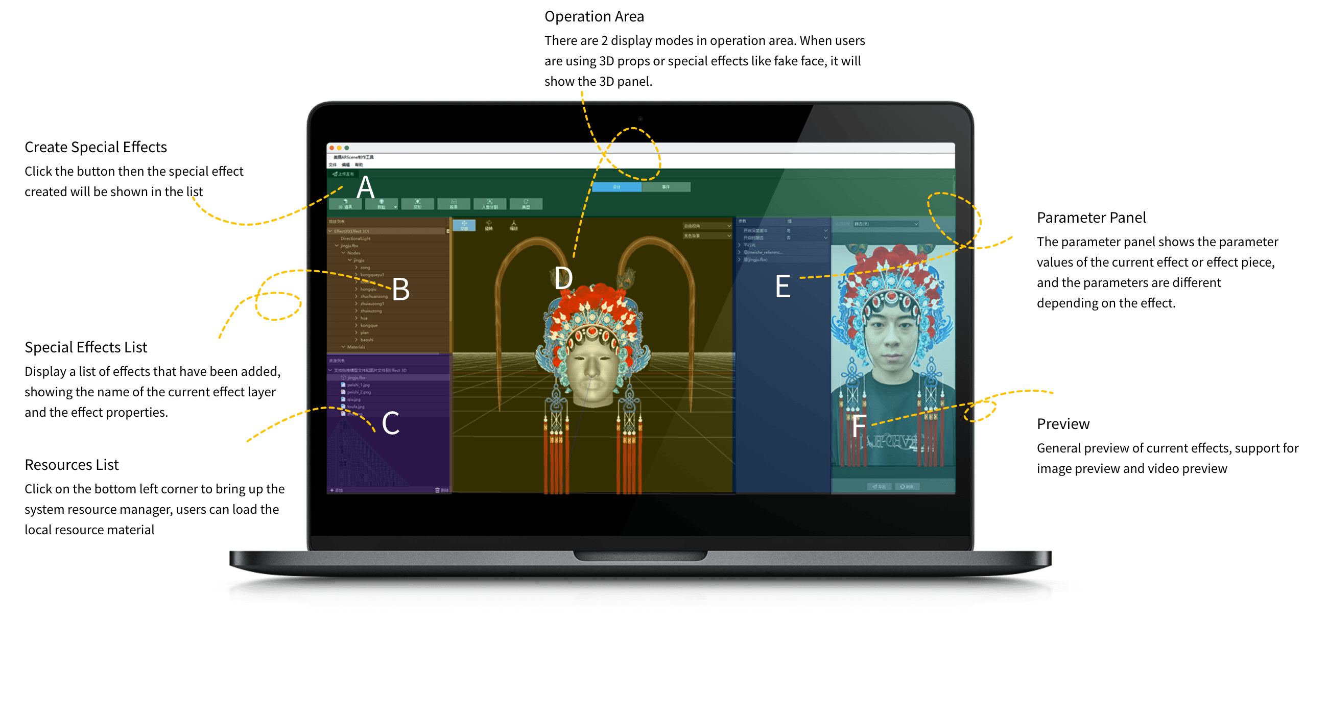 Support 2D props, 3D props, face deformation, face beauty, foreground special effects, portrait background style, trigger gameplay and other types of props, support users to make various types of props by themselves, and adjust the corresponding texture effects , bone physics and other parameters.