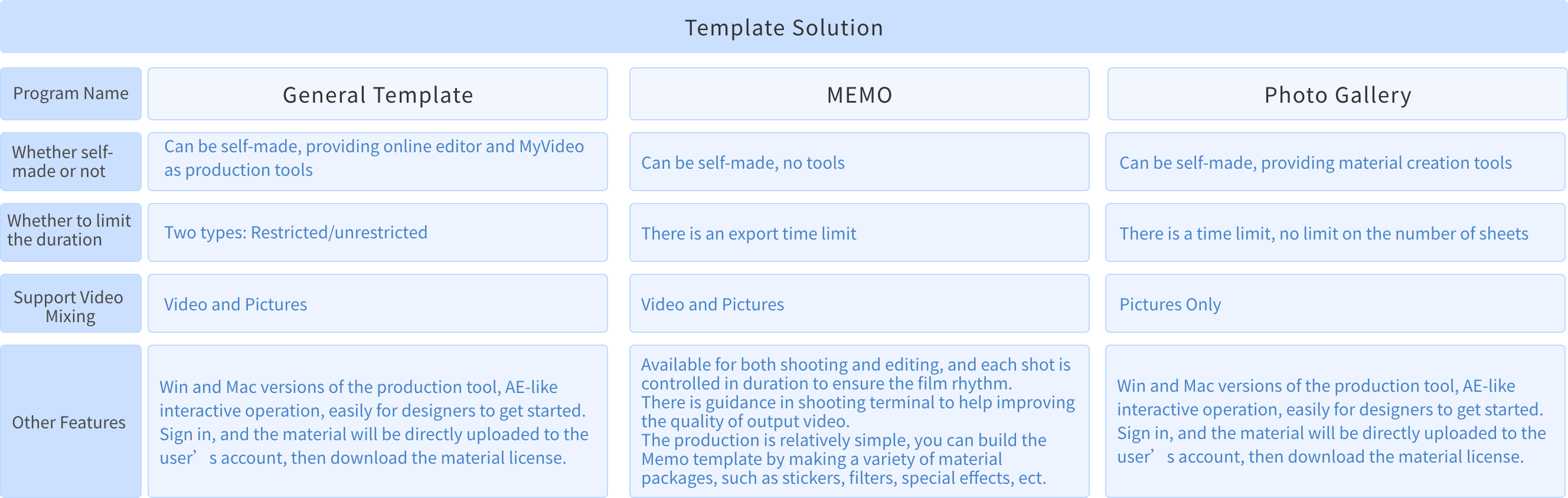 Meet the demands of various current scenarios for templates, allowing users to quickly form a wonderful video by simply applying the template and importing the video, and at the same time, secondary editing can be performed based on the template, and Meishe provides cloud-to-mobile Template creation tool, unified template package to meet the demands of cross-platform use.