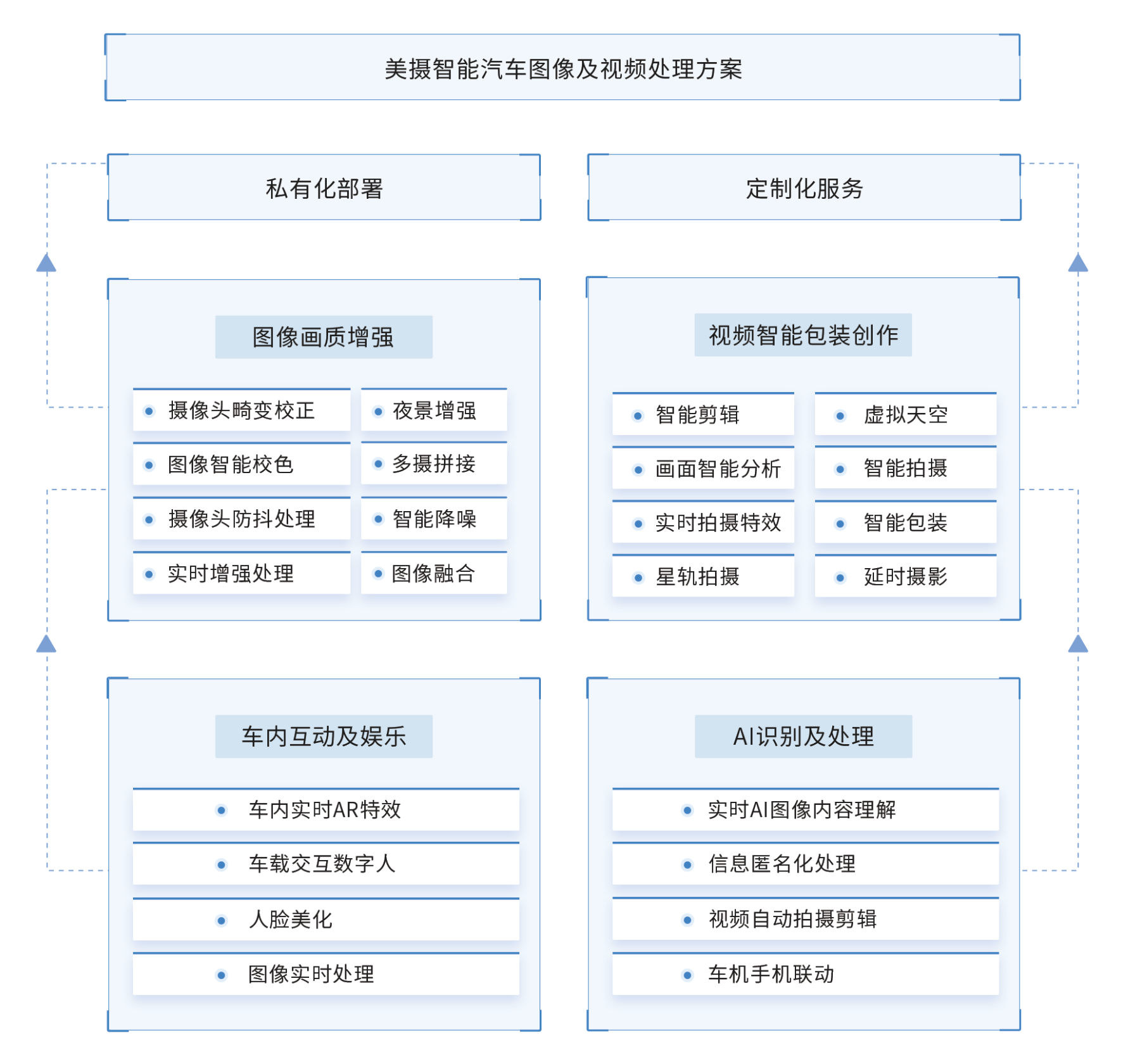 美摄提供从摄像头、车载视频创作、车内娱乐和AI识别的全链路算法,针对车辆特殊的拍摄内容和场景进行优化,通过美摄的汽车方案能力,通过软件方式大大提升车载的影像能力,同时智能化的分析处理,让更多车载价值视频产生,提升车主的驾乘体验。