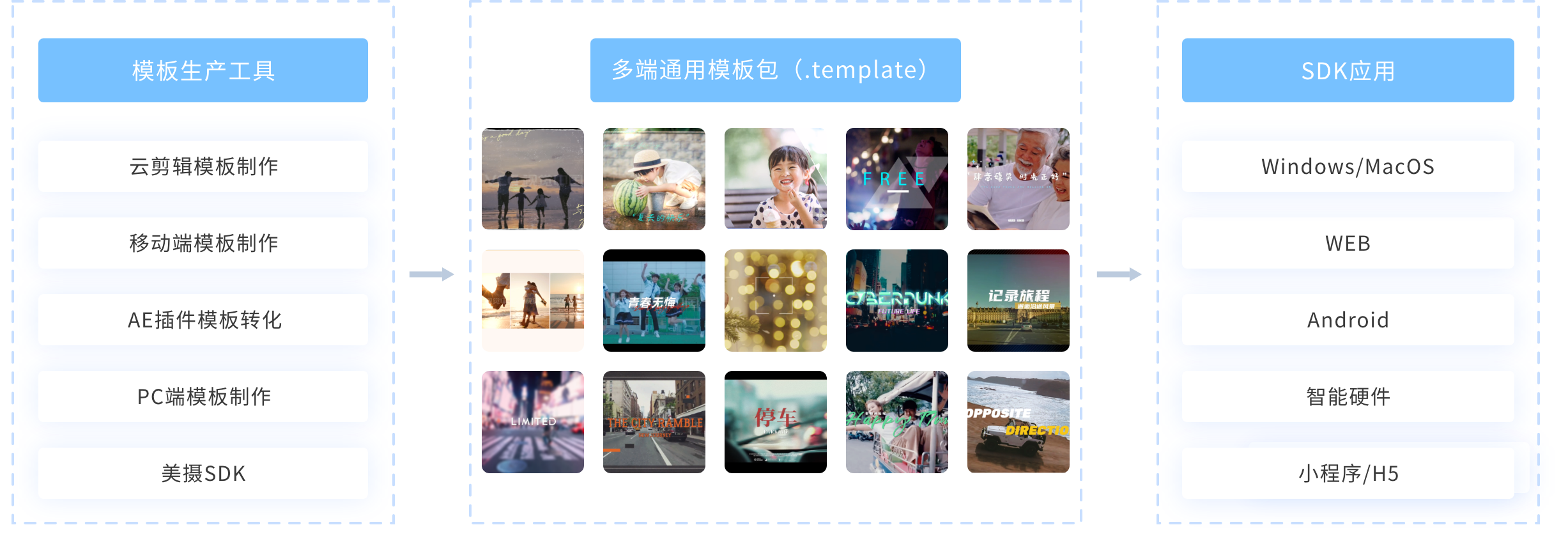 通过完善的工具链让客户进行模板制作,并生成标准模板文件,可以在移动端、WEB、PC等多端使用