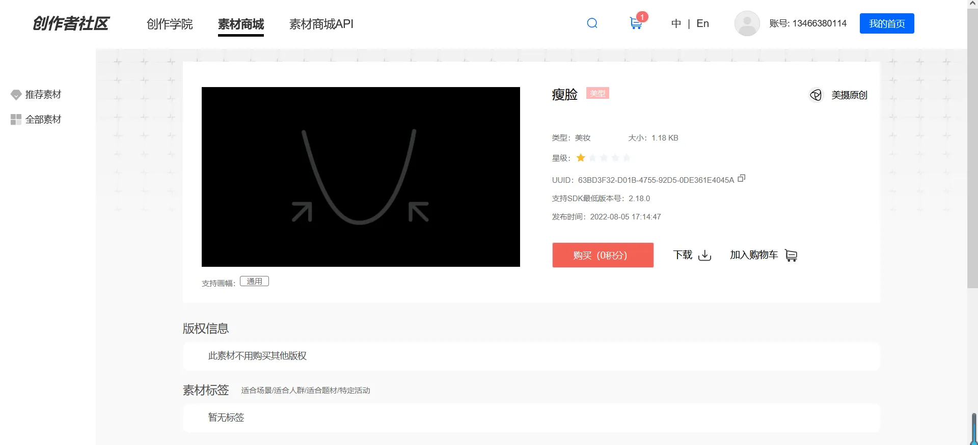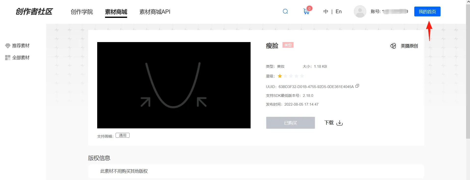 *【0积分素材】为美摄提供的免费素材,除版权素材外,在接入测试阶段,您可以直接购买,并在已购里下载使用该素材包。
