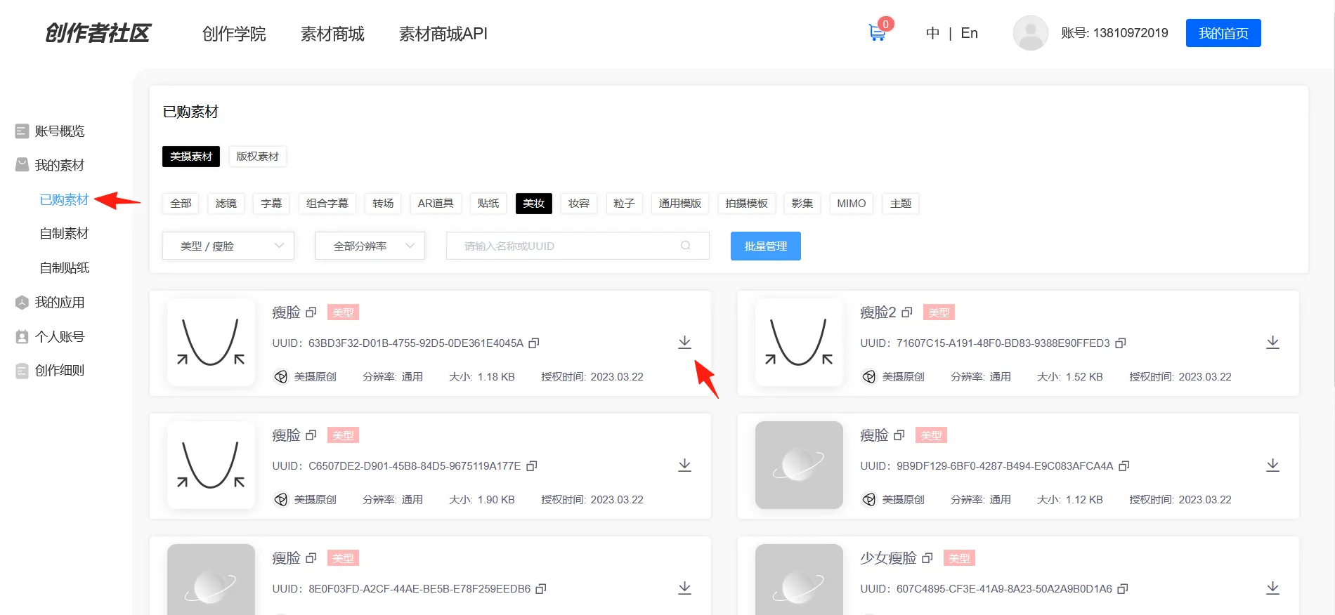 然后进入【我的首页】-【我的素材】-【已购素材】-【下载】